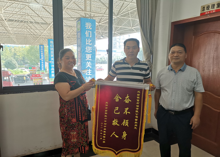 8月19日上午,銀富石油辦公室來了兩位陌生的人,他們帶著書有“奮不顧身,舍己救人”的錦旗要親口對救他們母親的救命恩人徐兵――道一聲“謝謝”。銀富總部的人誰也不知徐兵英勇救人的事,還真有點(diǎn)丈二和尚摸不著頭腦。記者在現(xiàn)場采訪救人英雄徐兵才了解到事情原委:7月11 日,徐兵在下班途中經(jīng)過三橋下手路段時,聽到不少人站在資江大堤上呼喊“有人落水啦”。徐兵當(dāng)即停好車,奔向大堤一看,只見江面漂著一個仰面朝天的人,落水者離堤岸較遠(yuǎn),也看不清是什么樣的人。徐兵見狀一邊撥打了對面市海事局的救援電話,一邊脫衣奔向江邊跳入江中救人。7月11日,資江水位達(dá)到警戒水位,水流湍急。當(dāng)過兵的徐兵有著一股子奮勇向前不怕犧牲的精神,全然不顧自己的安危。他拼命向落水者游去,游到落水者旁邊一看是位老太太,老太太雙手抓著一根棍子,徐兵連忙對老太太說:“你莫急,我來救您了。您抓住手中的棍子就是的。”隨即徐兵伸手抓著老人手中的棍子艱難地向堤岸游終于將老人救到岸邊,在岸邊熱心群眾的幫助下,徐兵將老人抬到了岸上。上岸后徐兵立即撥打了120急救電話后,隨后用自己的衣服幫老人擦去身上臉上的臟物,同時守在老人身邊抓住老人的手安慰的對老人說:“您不用怕了,120馬上就到了。”幾分鐘后,120急救車趕到現(xiàn)場,徐兵將老人送上急救車后悄悄地離開了現(xiàn)場。離開前趕到現(xiàn)場的110民警要求徐兵留下了身份證號碼和電話。徐兵英勇救助人的善行義舉銀富公司誰都不知道。8月19日,老人的女兒劉銀芝和兒子劉文榜到銀富石油送錦旗才得知被救老人名叫隆小春,今年78歲了,家住資陽區(qū)六中。老人的兒子在廈門工作,前向回家來,幾經(jīng)輾轉(zhuǎn)找到110后才得知救他們母親的英雄是銀富石油的員工,這才有了開頭的一幕!