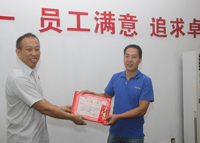 公司副總經理王飛躍(左)給徐兵頒發(fā)榮譽證書和獎金