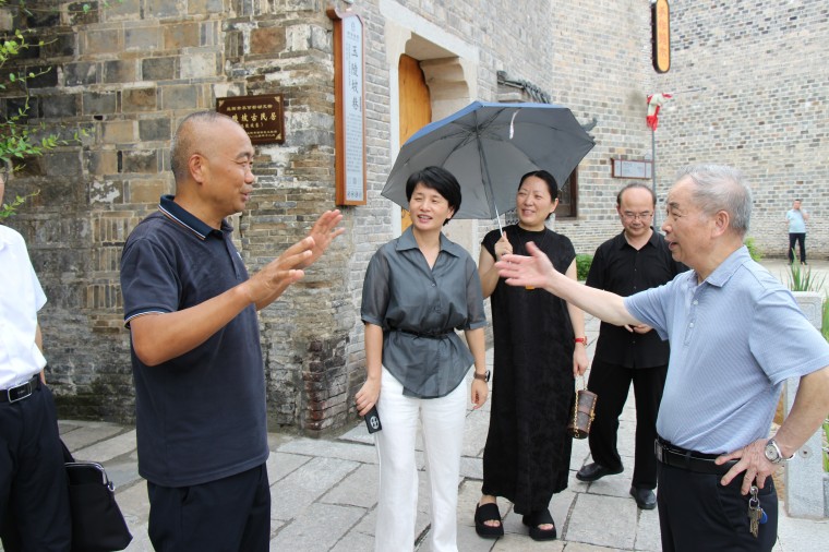 董事長(zhǎng)(右一)給考察團(tuán)一行介紹明清古巷情況。